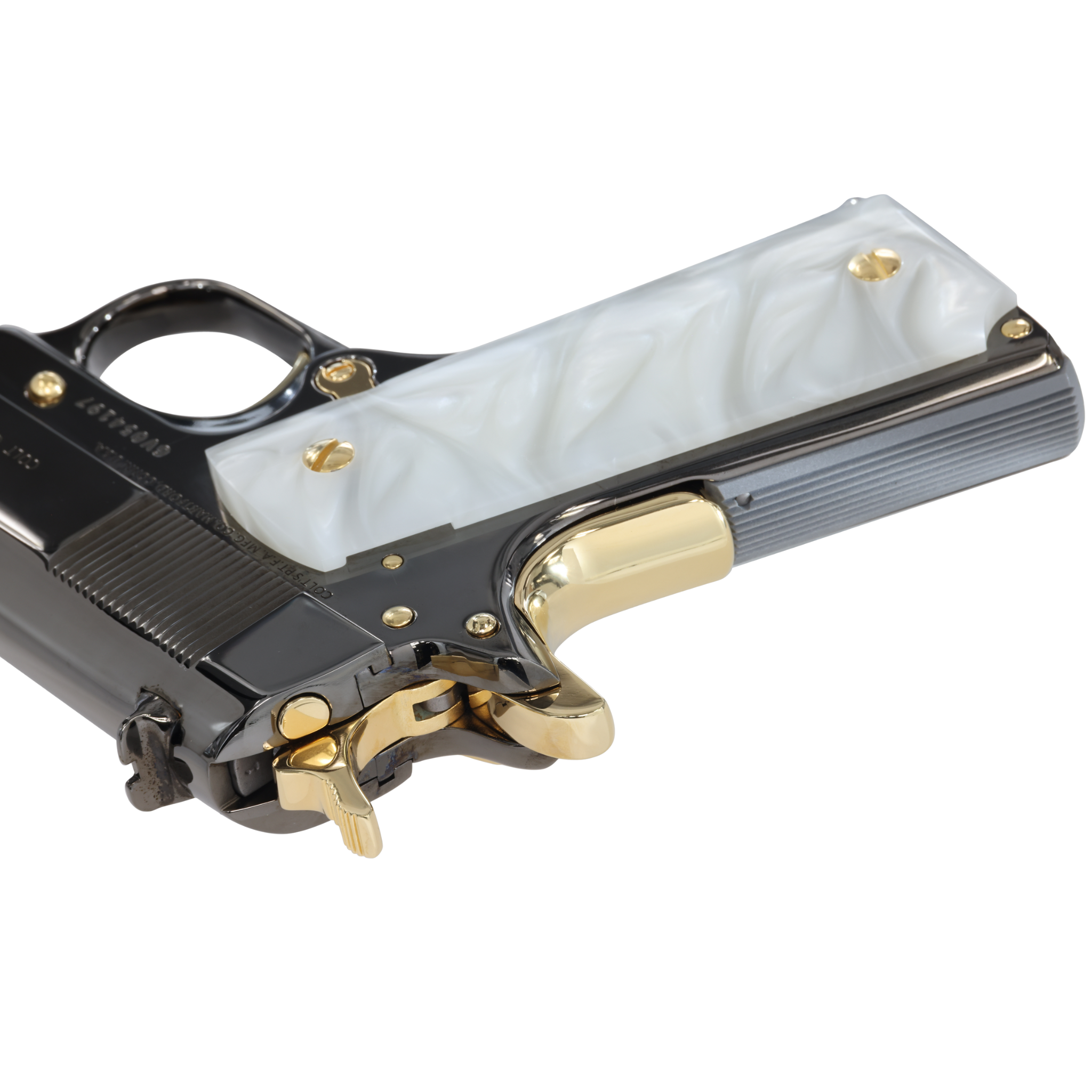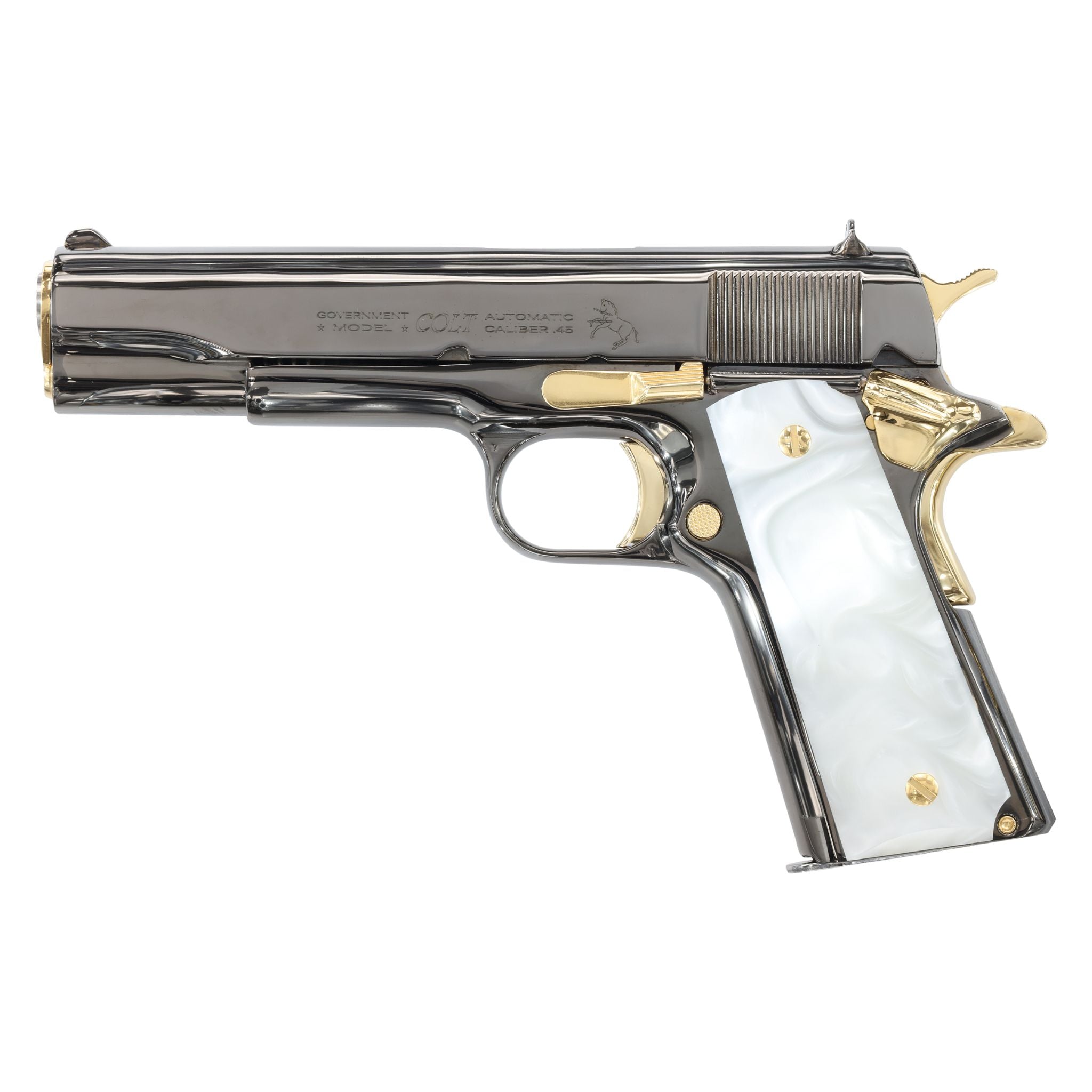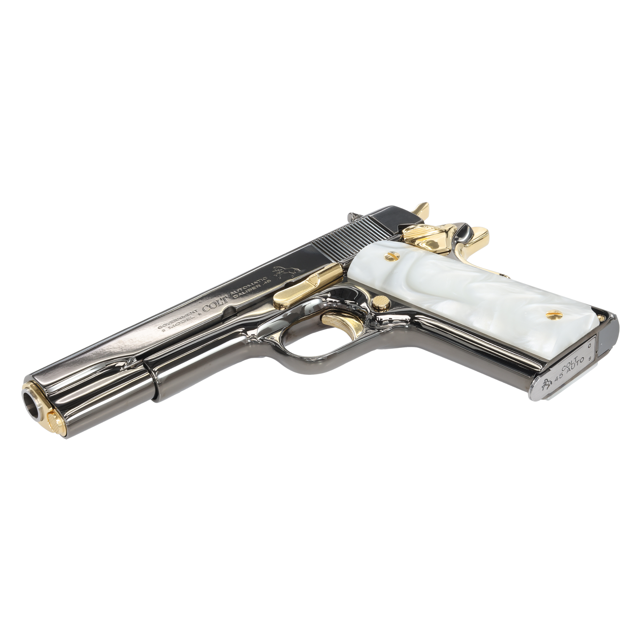 COLT 1911 Government, 45ACP, Mirror Finish Black Chrome with 24K Gold Plated Accents, White Pearlized-Polymer Grips