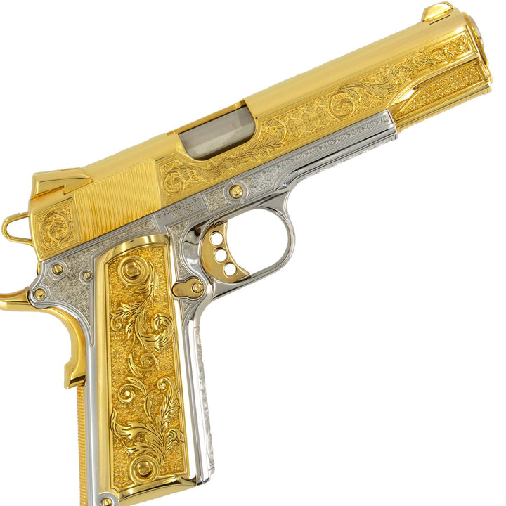 French Baroque Springfield 1911 Garrison 9mm White Chrome frame with 24 Karat Gold Slide and Accents